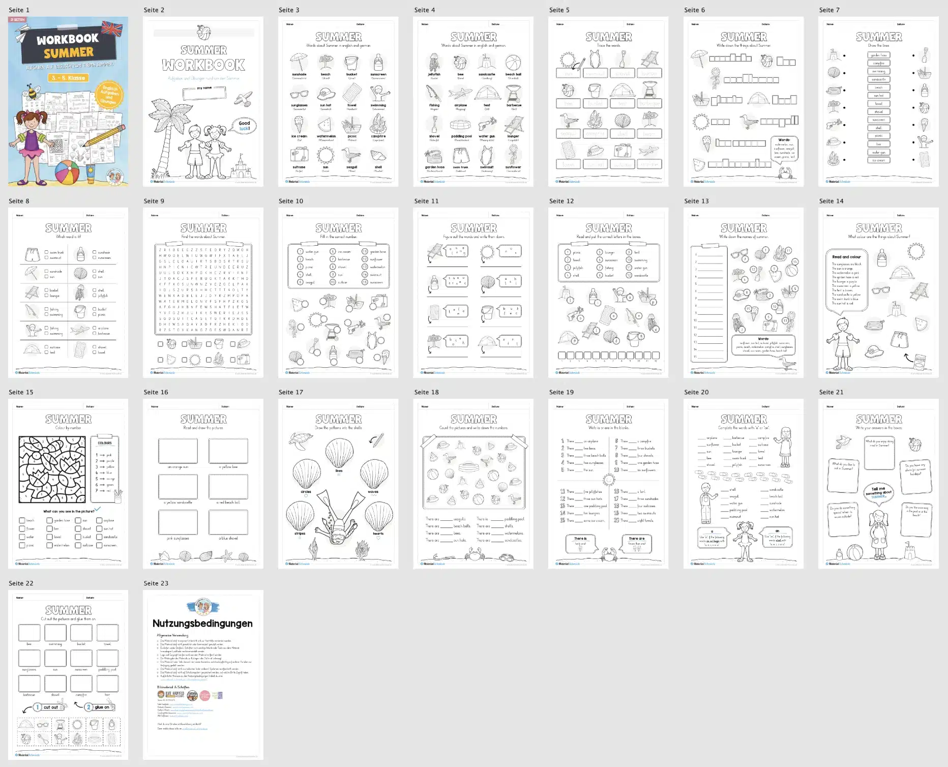 Hier findet ihr ein Arbeitsheft rund um das Thema Sommer / Summer für den Englischunterricht mit insgesamt 21 Arbeitsblättern.