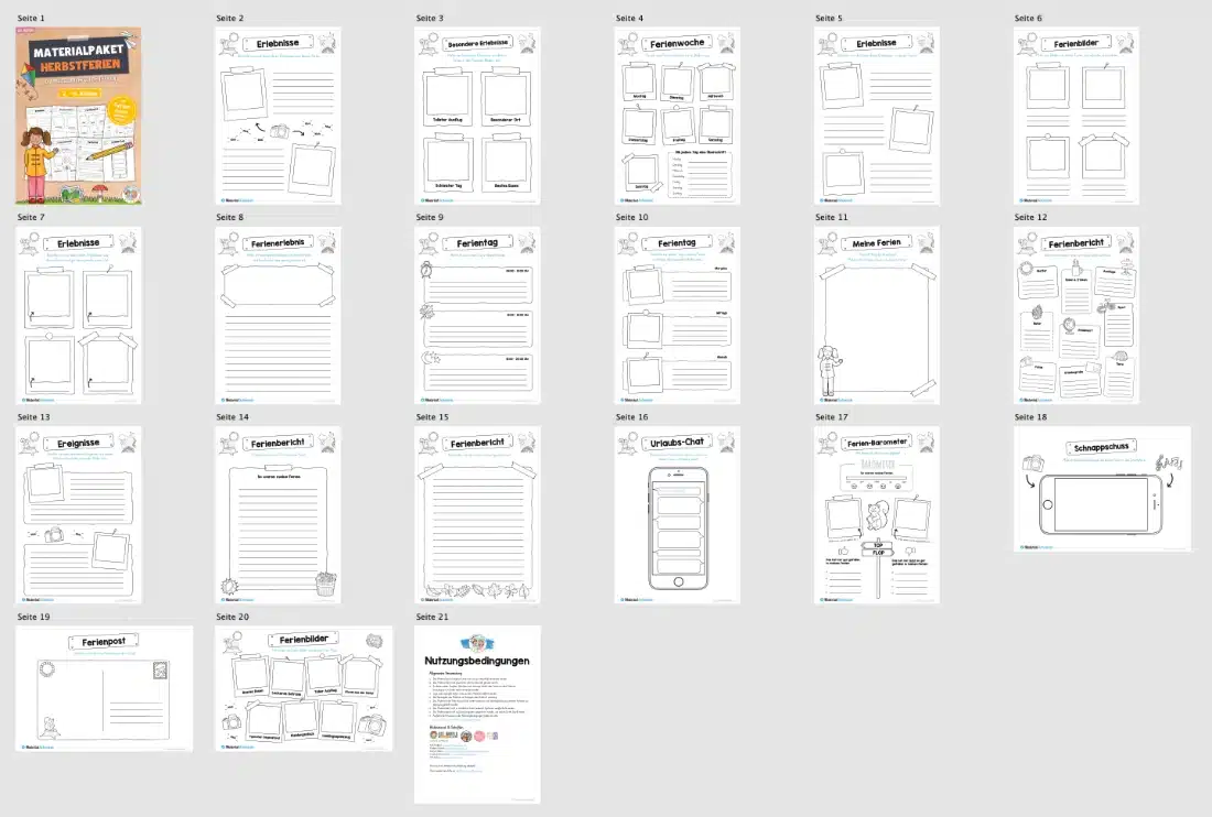 Mit Hilfe der Arbeitsblätter können die Schüler ihre Herbstferien Revue passieren lassen und auf unterschiedliche Art und Weise davon berichten. Aus den 20 Arbeitsblätter solltet ihr später die für euren Unterricht am besten passenden Übungsblätter heraus suchen und zum Einsatz bringen.