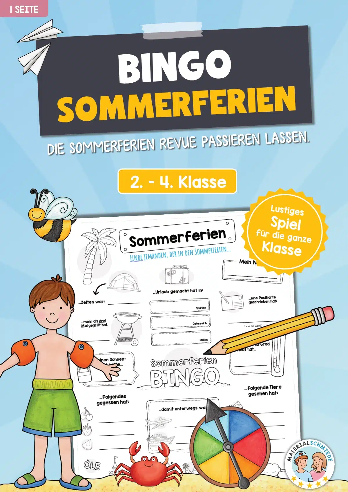 Bei dem interaktiven Sommerferien-Bingo sollen die Schüler jeweils jemanden in der Schulklasse finden, der ein vorgegebenes Ereignis erlebt hat. Beispielsweise soll ein Schüler bzw. eine Schülerin gefunden werden, der/die seine/ihre Sommerferien in Italien oder Spanien verbracht hat. Außerdem soll jemand gefunden werden, der in den Sommerferien Geburtstag hatte, zelten war oder ein Gewitter erlebt hat.