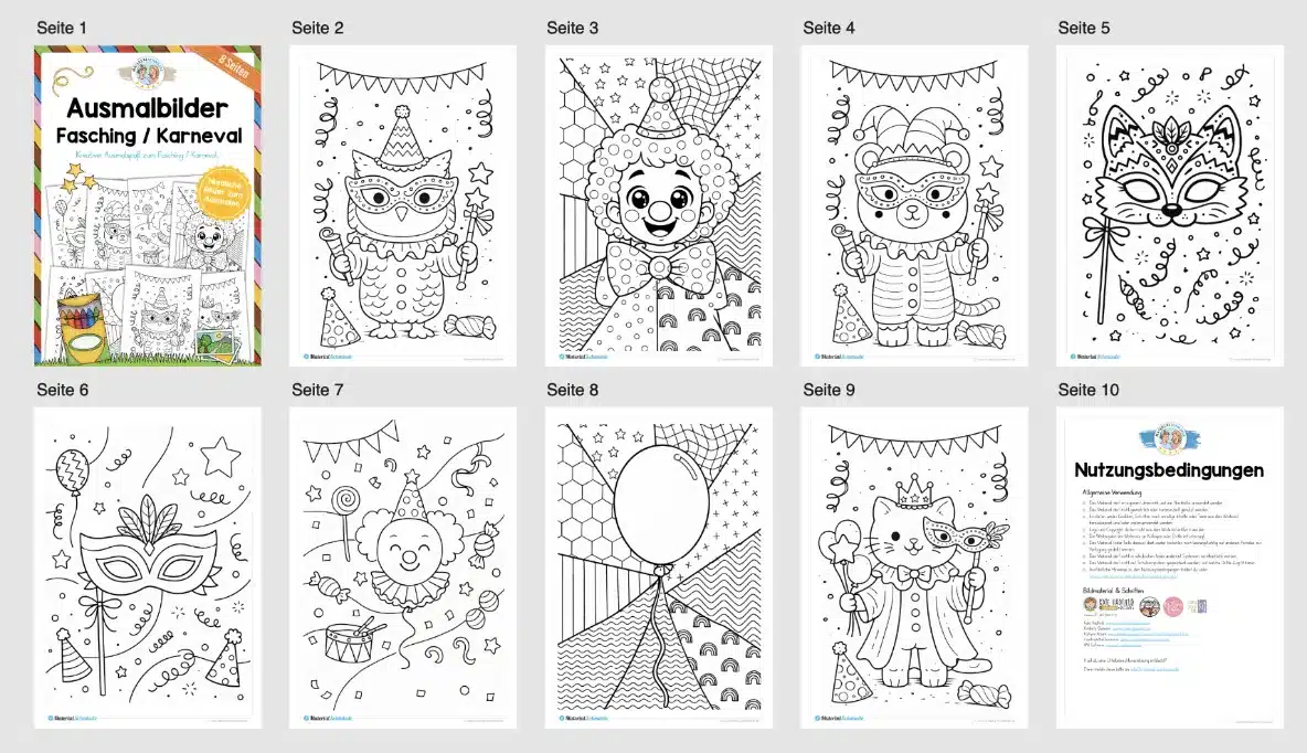 Die Ausmalbilder fördern Kreativität, Feinmotorik und Konzentration und lassen sich vielseitig im Unterricht, in der Betreuung oder als ruhige Beschäftigung in der Faschingszeit einsetzen. Besonders gut geeignet als Unterrichtsmaterial für die Wochen rund um Karneval, für Vertretungsstunden, Projekttage oder als kreative Aufgabe zwischendurch.