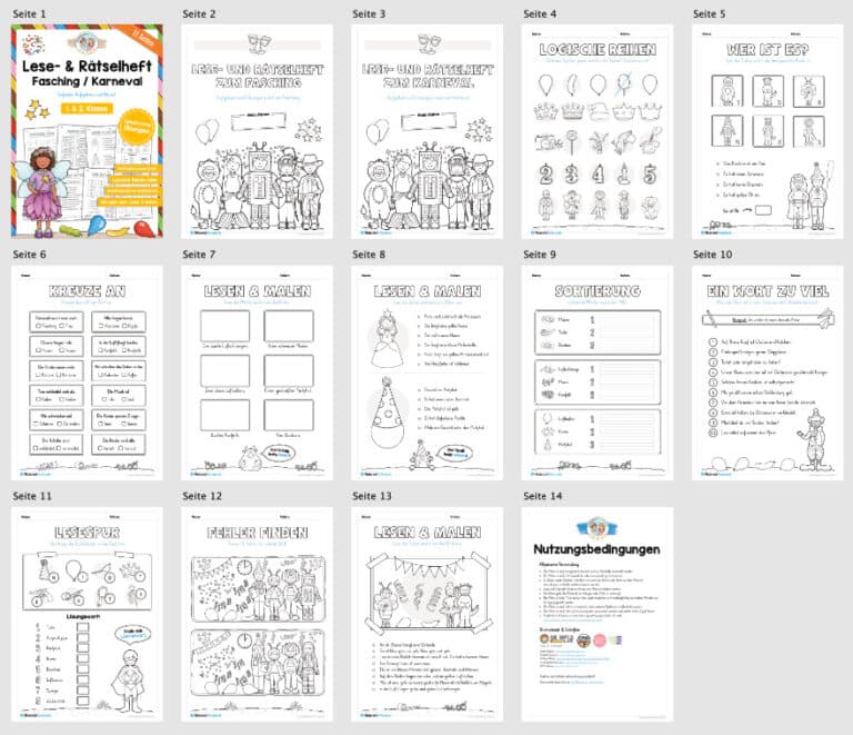 Hier findet ihr ein Lese- und Rätselheft zum Fasching/Karneval für die 1. und 2. Klasse mit insgesamt 11 Seiten.