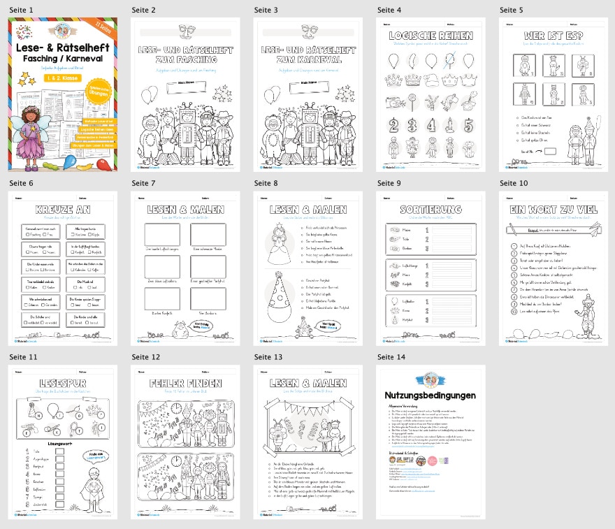 Hier findet ihr ein Lese- und Rätselheft zum Fasching/Karneval für die 1. und 2. Klasse mit insgesamt 11 Seiten.