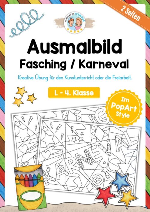 Den PopArt Ausmalbild zum Fasching bzw. Karneval könnt ihr gut von der 1. bis zur 4. Klasse einsetzen im Kunstunterricht, als Freiarbeit, in Vertretungsstunden oder einfach zwischendurch.