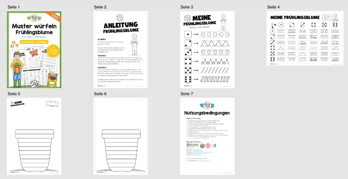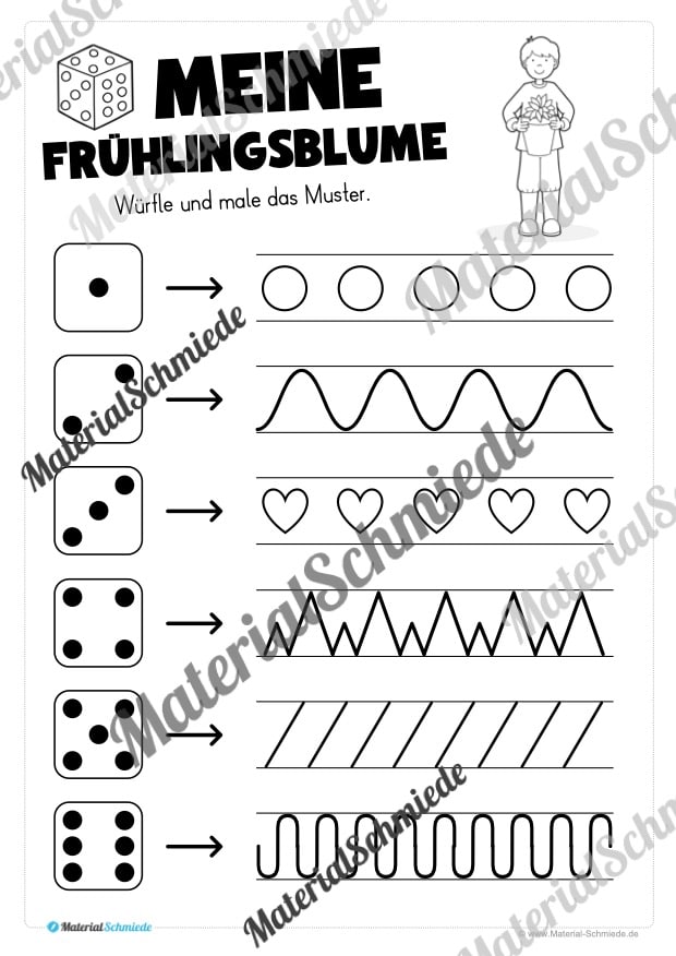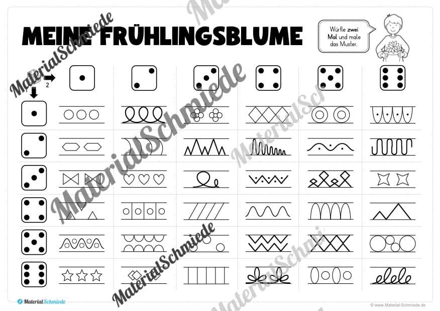 Die erste Würfelvorlage ist sehr einfach gehalten und richtet sich an Kinder in der Vorschule sowie der 1. Klasse. Es soll gewürfelt und das entsprechende Muster in die Zeile des Blumentopfes übertragen werden. Dies soll fortgesetzt werden, bis kein Platz für weitere Muster vorhanden ist.