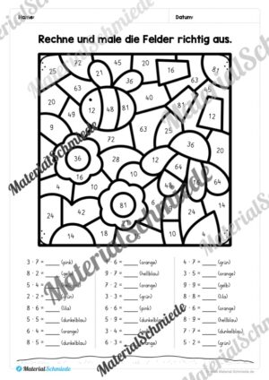 Die Schüler sollen die Rechenaufgaben auf den Arbeitsblättern lösen. Je nach Ergebnis, soll eine andere (vorgegebene) Farbe ausgemalt werden.