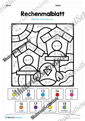 Die Aufgabe für die Schüler besteht darin, die Aufgaben im Zahlenraum bis 20 auf dem Bild zu lösen. Je nach Ergebnis, soll eine andere (vorgegebene) Farbe ausgemalt werden. So lernen die Schüler spielerisch Rechnen.