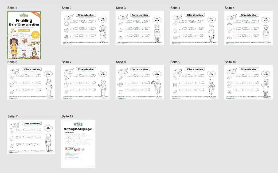 Dieses kleine Materialpaket enthält insgesamt 10 Seiten, auf denen die Schüler erste Sätze passend zum Frühling schreiben sollen.