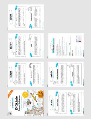 Dieses Unterrichtsmaterial beinhaltet insgesamt 10 Diktate zu Halloween. Alle Diktate sind relativ einfach gehalten, sodass ihr diese in der 3. und 4. Klasse zum Einsatz bringen könnt. Dabei besitzen die Diktate jeweils ca. 60-70 Wörter.