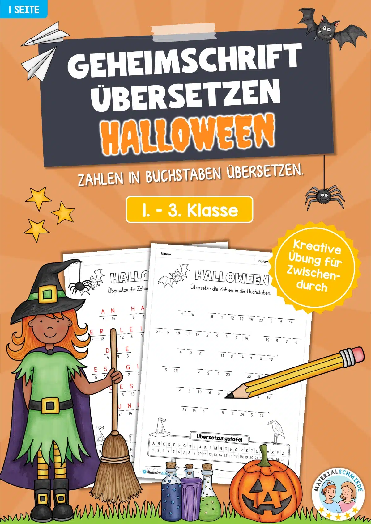 Mit diesem Arbeitsblatt wird das Alphabet spielerisch geübt! Die Kinder entschlüsseln anhand einer Übersetzungstabelle (A = 1, B = 2, … Z = 26) eine Botschaft zu Halloween. Jede Zahl steht für einen Buchstaben – und mit ein wenig Knobelei entsteht ein kurzer, thematisch passender Text rund um das Thema Halloween.