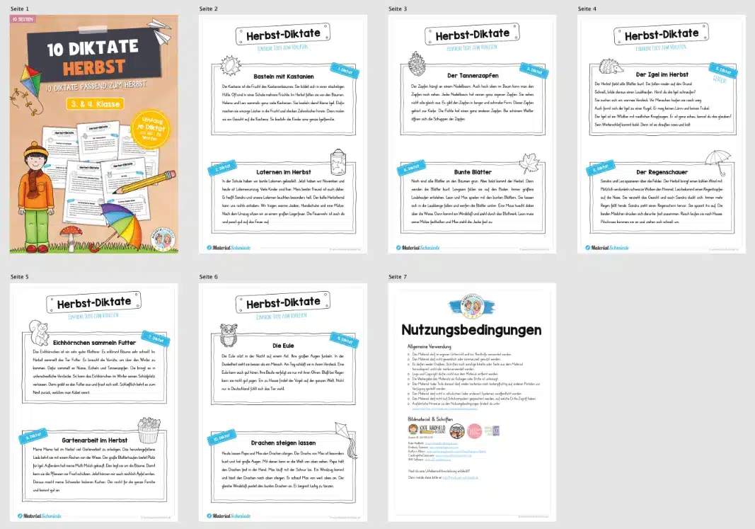 Dieses Unterrichtsmaterial beinhaltet insgesamt 10 Diktate zum Herbst (PDF). Alle Diktate sind relativ einfach gehalten, sodass ihr diese in der 3. und 4. Klasse zum Einsatz bringen könnt. Dabei besitzen die Diktate jeweils ca. 60-70 Wörter.