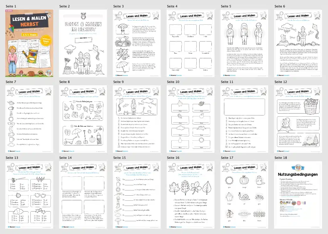 Um das Lesen mit einer spielerischen Komponente zu verknüpfen, eignet sich das Malen hervorragend. Die Schüler erhalten auf den 15 PDF-Seiten verschiedene Aufgaben und Übungen, die nur gelöst werden können, wenn das Lesen mit dem Malen kombiniert wird. Dabei dreht sich hier alles um den Herbst.