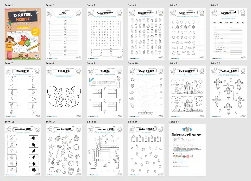 Dieses Materialpaket enthält insgesamt 15 einfache Rätsel zum Thema Herbst für Kinder in der 1. und 2. Klasse inkl. Lösungen (als PDF).