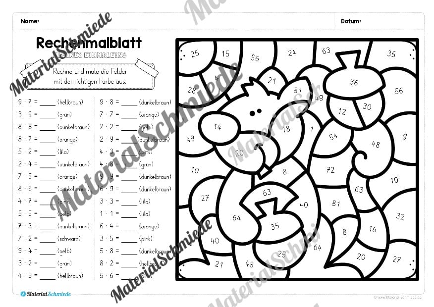 Die Aufgabe für die Schüler besteht darin, die Aufgaben zum kleinen Einmaleins auf dem Arbeitsblatt zu lösen. Je nach Ergebnis, soll eine andere (vorgegebene) Farbe ausgemalt werden. So lernen die Schüler spielerisch das kleine Einmaleins.