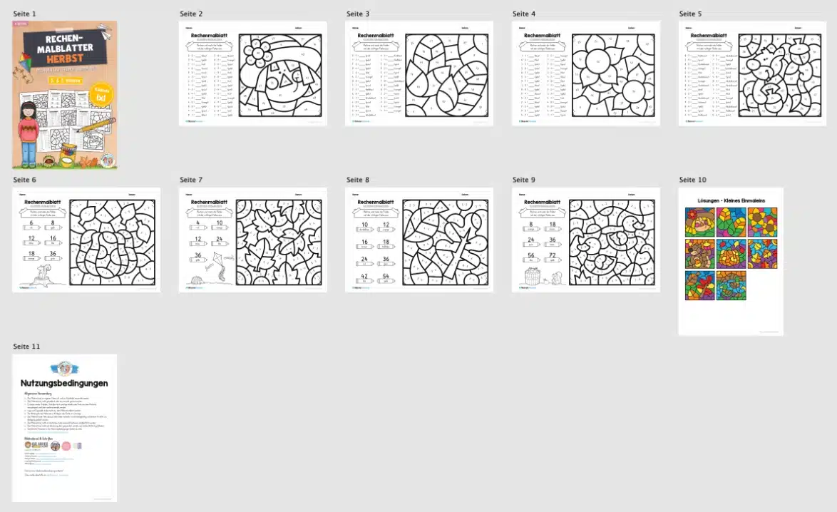 Dieses Materialpaket beinhaltet 8 Rechenmalblätter zum Herbst mit Aufgaben zum kleinen Einmaleins.