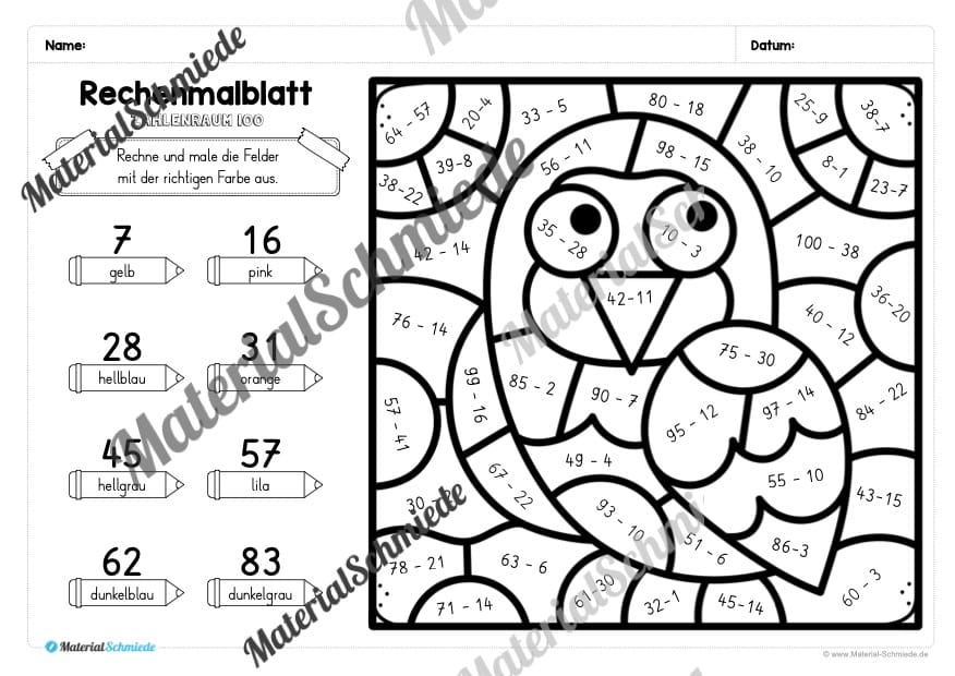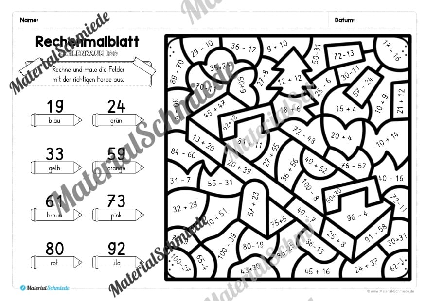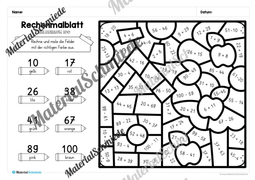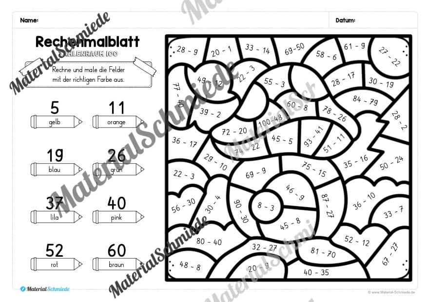 Die Schüler sollen die Rechenaufgaben auf den Arbeitsblättern lösen. Je nach Ergebnis, soll eine andere (vorgegebene) Farbe ausgemalt werden.