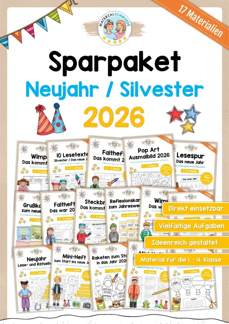 Mit unserem vielseitigen Sparpaket rund um Silvester und das neue Jahr 2026 gestaltet ihr den Jahreswechsel im Unterricht bewusst, spielerisch und abwechslungsreich. Mit den Unterrichtsmaterialien können die SchülerInnen das vergangene Jahr zureflektieren, persönliche Erlebnisse Revue passieren zu lassen und mit Neugier und Motivation auf das neue Jahr blicken.