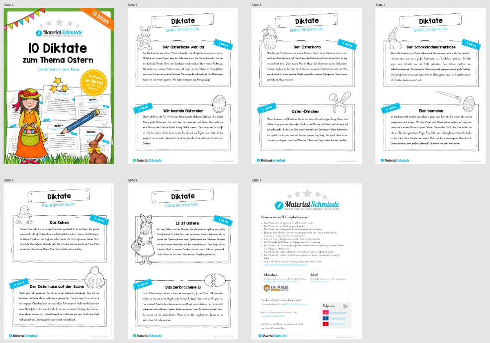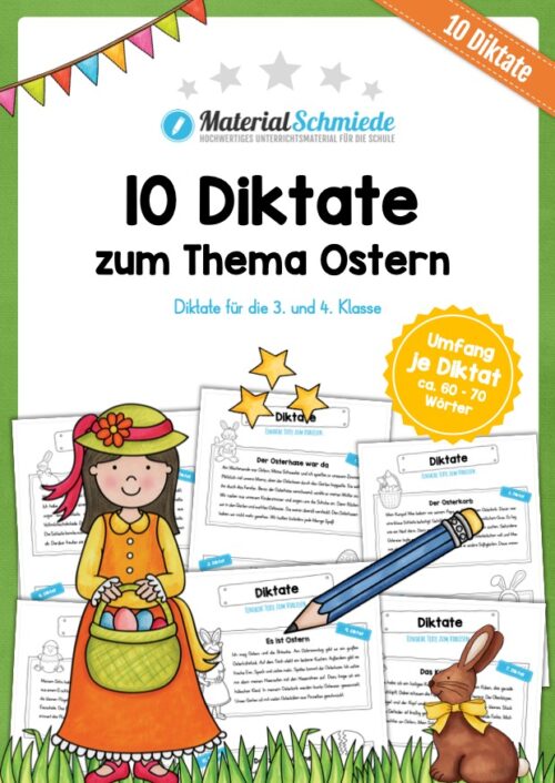 Dieses Unterrichtsmaterial beinhaltet insgesamt 10 Diktate zu Ostern. Alle Diktate sind relativ einfach gehalten, sodass ihr diese in der 3. und 4. Klasse zum Einsatz bringen könnt. Dabei besitzen die Diktate jeweils ca. 60-70 Wörter.