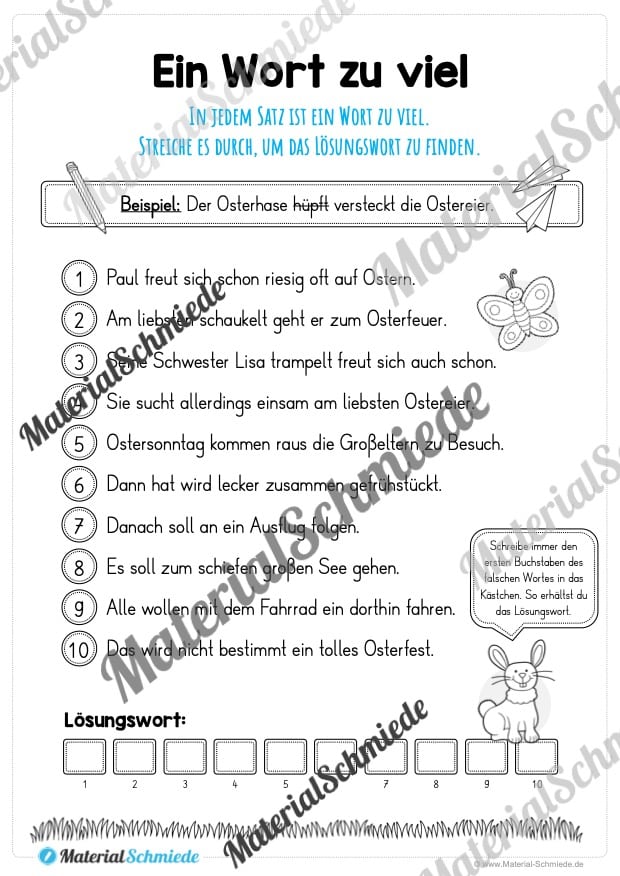 Insgesamt sind 10 Sätze vorgegeben. In jedem Satz hat sich jedoch ein Wort eingeschlichen, welches keinen wirklichen Sinn ergibt. Die Schüler sollen dieses Wort erkennen und durchstreichen. Alle Anfangsbuchstaben der durchgestrichenen Wörter ergeben später das gesuchte Lösungswort.