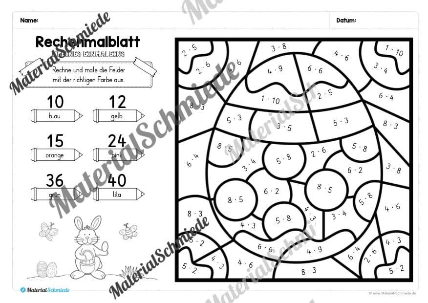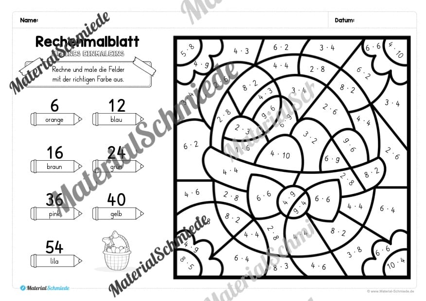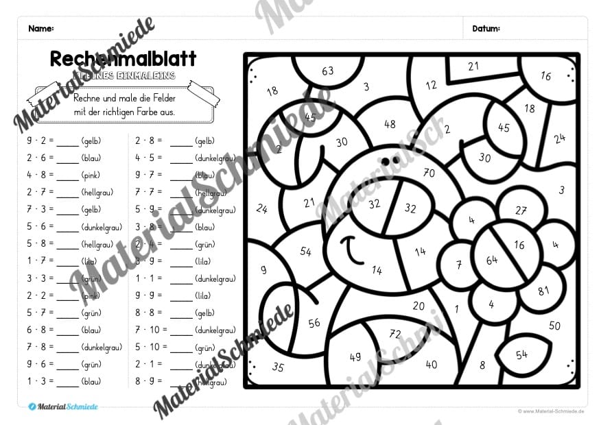 Die Aufgabe für die Schüler besteht darin, die Aufgaben zum kleinen Einmaleins auf dem Arbeitsblatt zu lösen. Je nach Ergebnis, soll eine andere (vorgegebene) Farbe ausgemalt werden. So lernen die Schüler spielerisch das kleine Einmaleins.