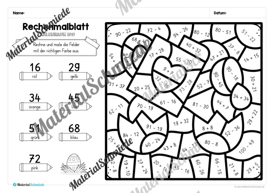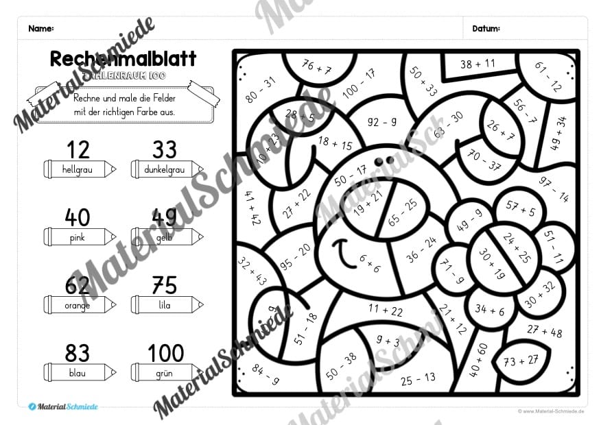 Die Schüler sollen die Rechenaufgaben auf den Arbeitsblättern lösen. Je nach Ergebnis, soll eine andere (vorgegebene) Farbe ausgemalt werden.