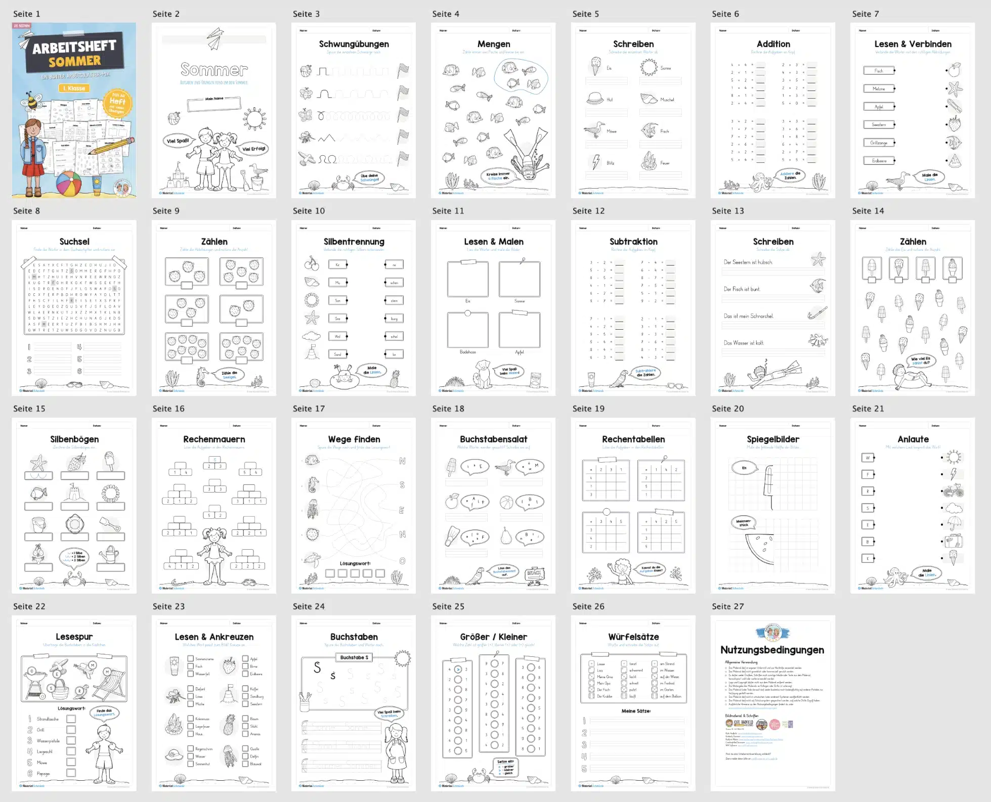 Hier findet ihr ein Arbeitsheft zum Thema Sommer für die 1. Klasse bestehend aus insgesamt 25 Seiten.