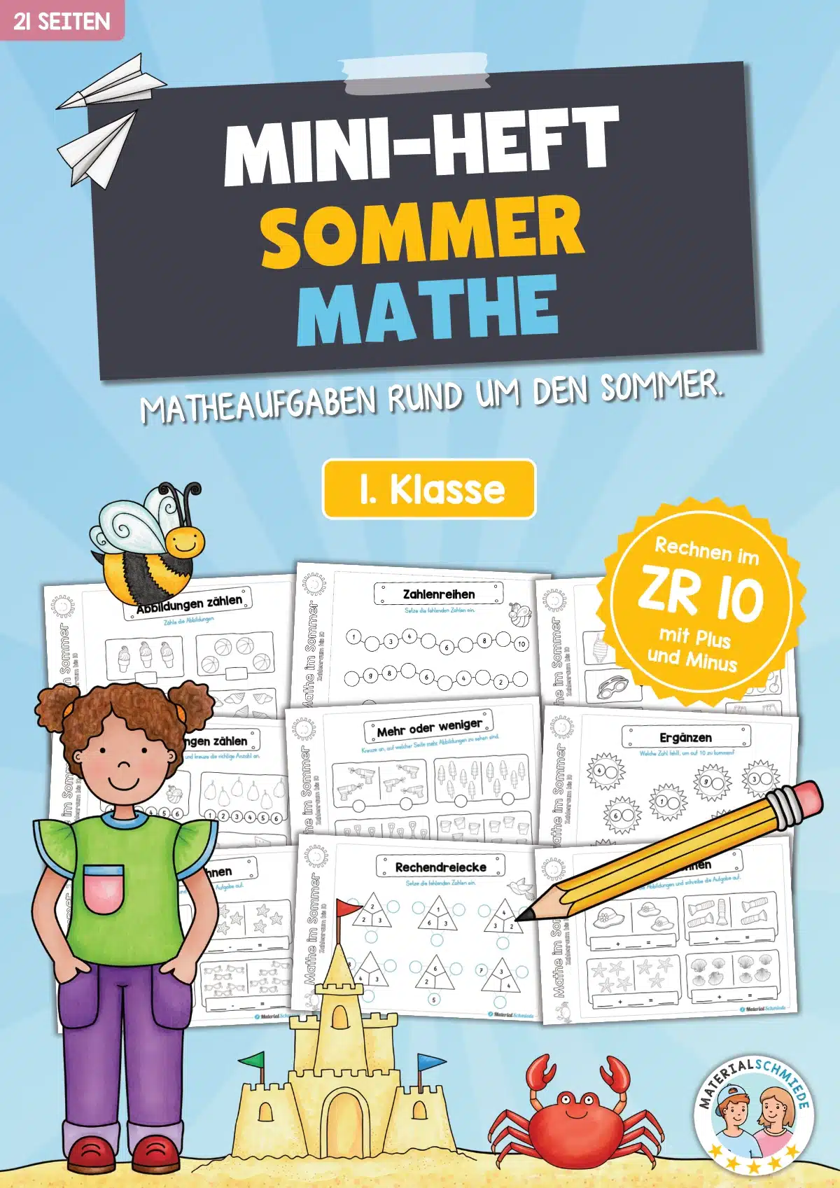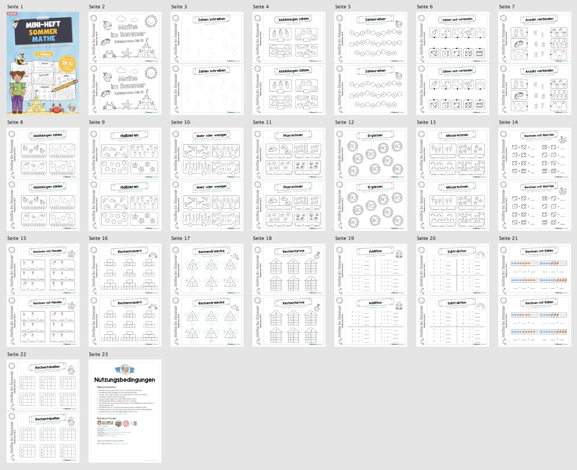 Dieses Materialpaket enthält insgesamt 21 Mathe Übungen rund um den Sommer im Zahlenraum bis 10.