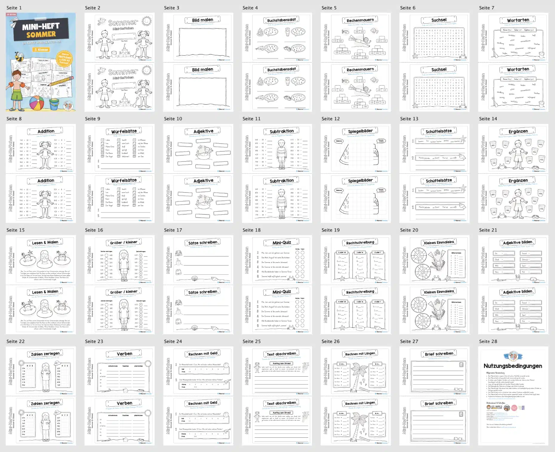 Hier findet ihr ein Mini-Heftchen zum Thema Sommer für die 3. Klasse bestehend aus insgesamt 25 Seiten.