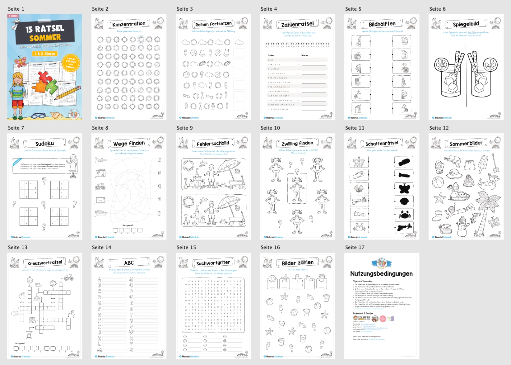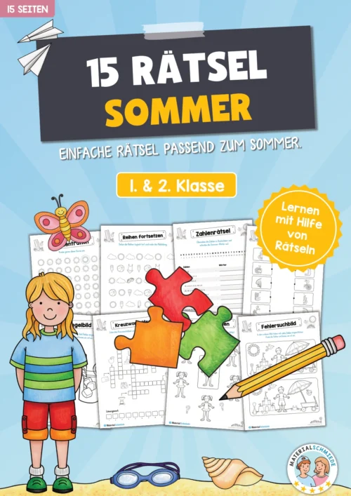 Dieses Materialpaket enthält insgesamt 15 einfache Rätsel zum Thema Sommer für Kinder in der 1. und 2. Klasse inkl. Lösungen (als PDF).