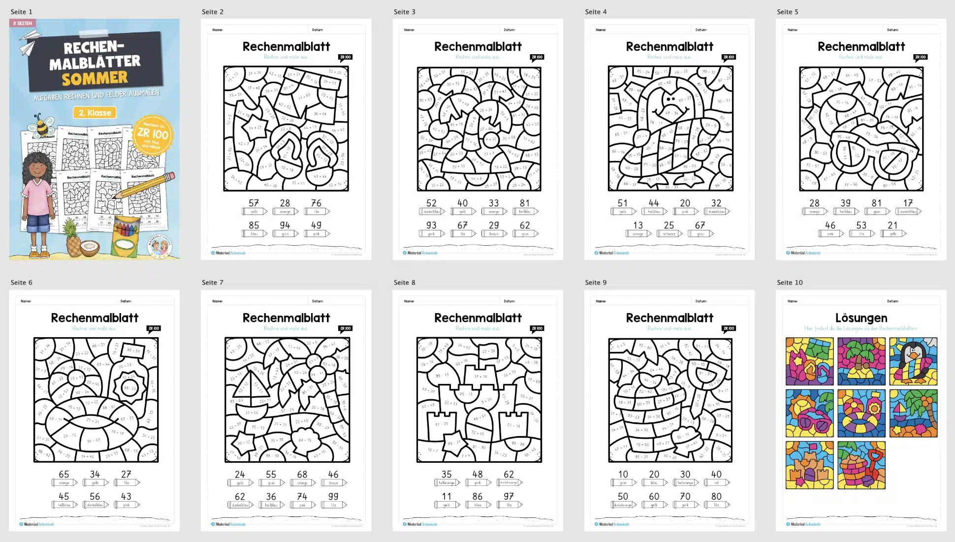 8 Rechenmalblätter zum Sommer im ZR 100.