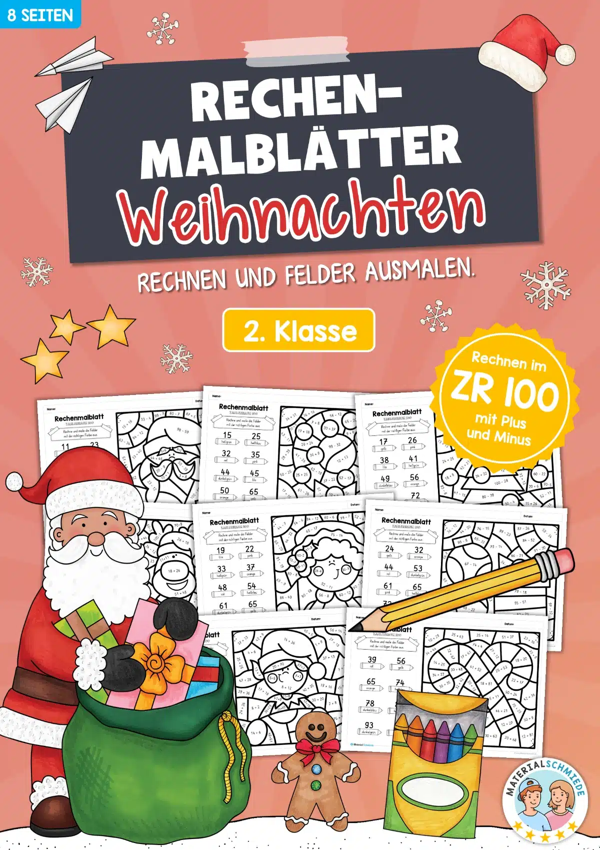 Dieses Materialpaket beinhaltet 8 Rechenmalblätter zu Weihnachten mit Übungen im Zahlenraum 100 mit Aufgaben zur Addition und Subtraktion.