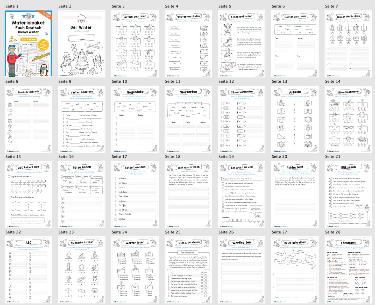 Materialpaket Winter: Deutsch 2. & 3. Klasse (25 Arbeitsblätter)