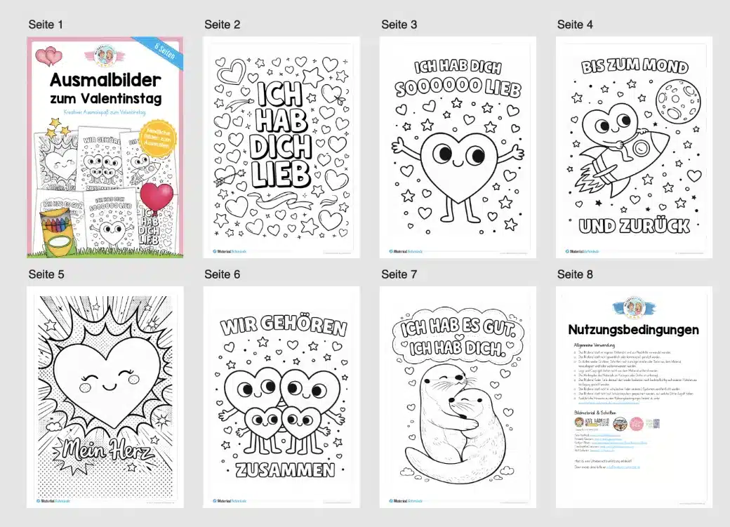 Diese liebevoll gestalteten Ausmalbilder zum Valentinstag eignen sich ideal für Kinder im Kindergarten und in der Grundschule. Auf 6 Ausmalseiten entdecken die Kinder typische Motive rund um den Valentinstag: Herzen, kleine Botschaften, Tiere und fröhliche Bilder zum Thema Liebe und Zusammenhalt.