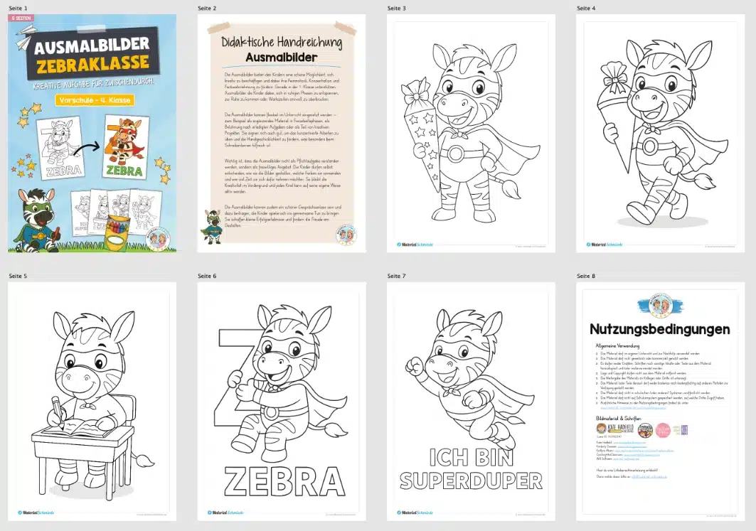 Hier findet ihr 5 Ausmalbilder für die Zebraklasse.