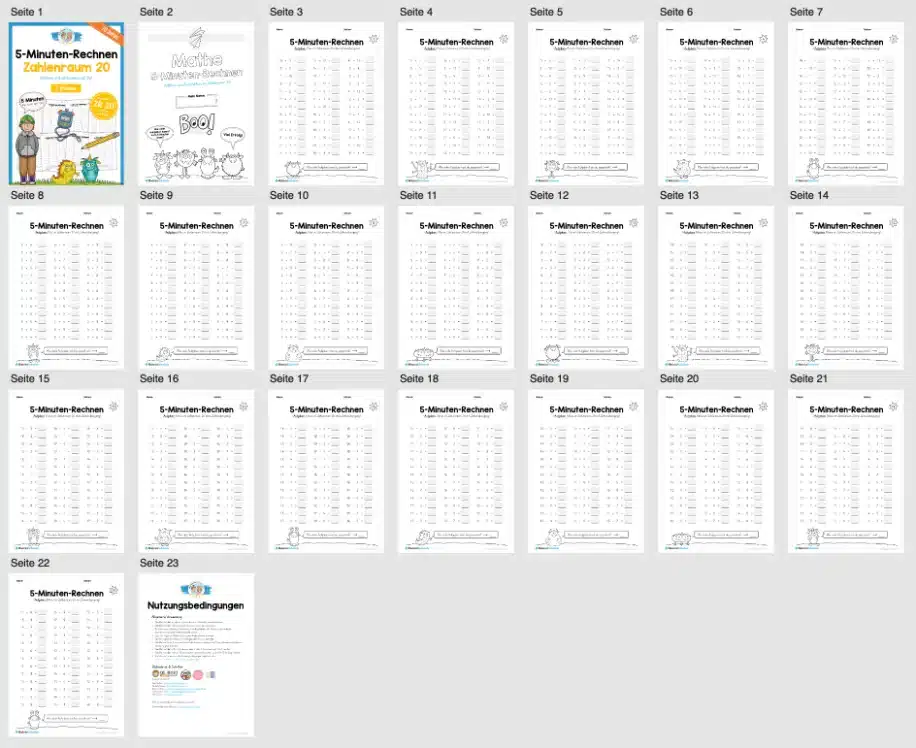 Dieses Materialpaket enthält insgesamt 20 Arbeitsblätter zum Thema 5-Minuten-Rechnen im Zahlenraum 20 mit Aufgaben zur Addition und Subtraktion.