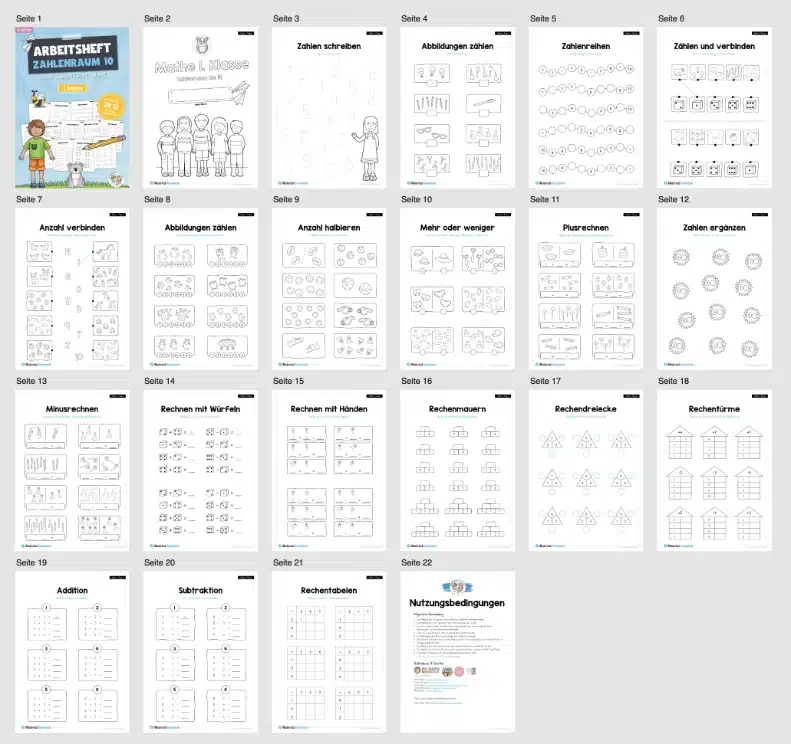 Dieses Materialpaket enthält insgesamt 20 Mathe Übungen für die 1. Klasse im Zahlenraum bis 10.