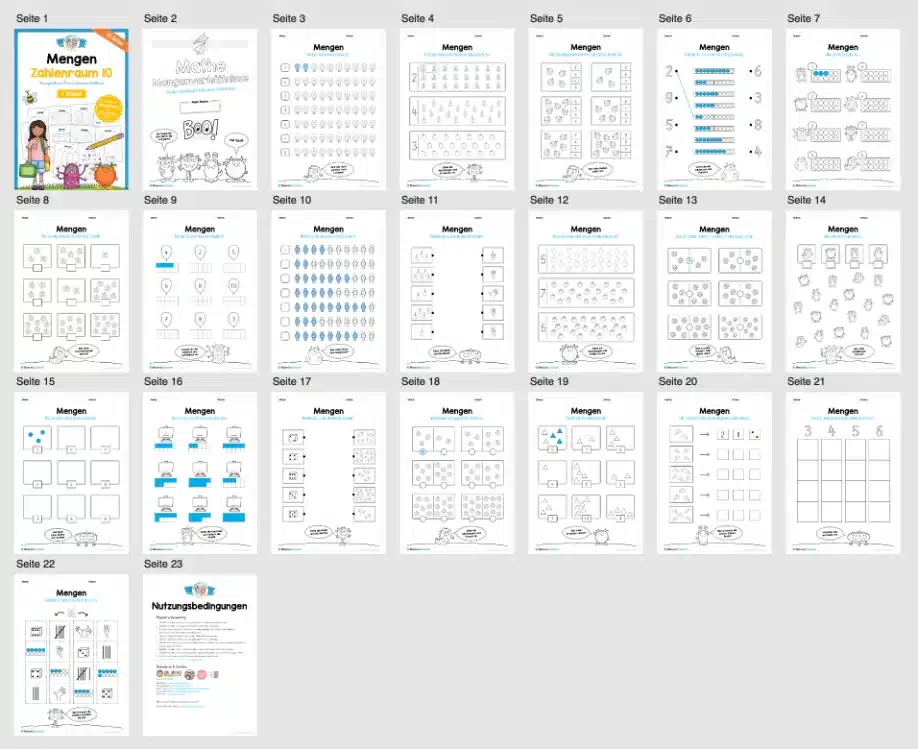 Dieses Materialpaket enthält insgesamt 20 Arbeitsblätter zum Thema Mengen und Mengenverhältnisse im Zahlenraum 10.