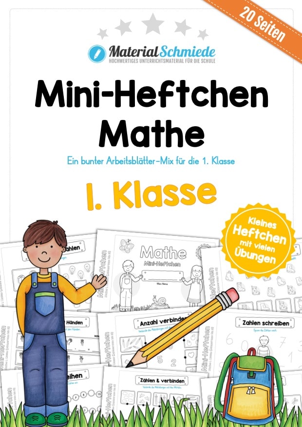 Hier findet ihr ein Mini-Heftchen zum Thema Mathe für die 1. Klasse bestehend aus insgesamt 20 Seiten.