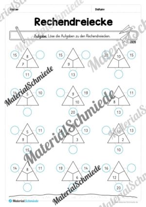 - 1 Arbeitsblatt Rechendreiecke im Zahlenraum 20: Alle Zahlen ausfüllen (Zahlen sind vorgegeben)