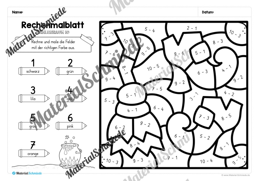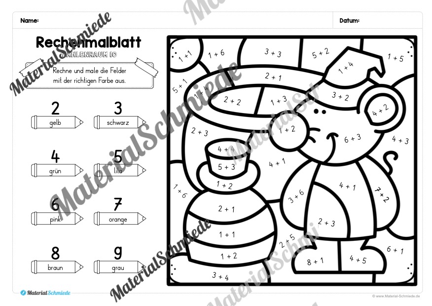 Die Aufgabe für die Schüler besteht darin, die Aufgaben im Zahlenraum bis 10 auf dem Bild zu lösen. Je nach Ergebnis, soll eine andere (vorgegebene) Farbe ausgemalt werden. So lernen die Schüler spielerisch Rechnen.