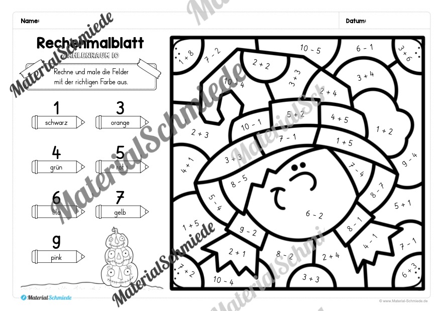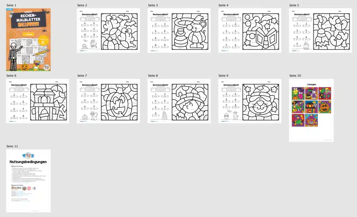 Dieses Materialpaket beinhaltet 8 Rechenmalblätter zu Halloween im Zahlenraum 10.