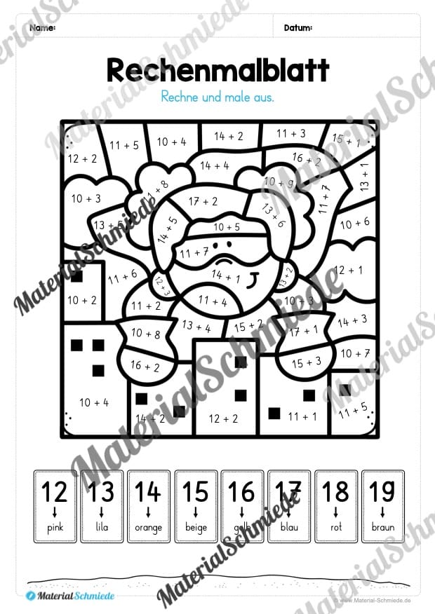 Die Aufgabe für die Schüler besteht darin, die Aufgaben zur Addition im Zahlenraum bis 20 auf dem Bild zu lösen. Je nach Ergebnis, soll eine andere (vorgegebene) Farbe ausgemalt werden. So lernen die Schüler spielerisch Rechnen.