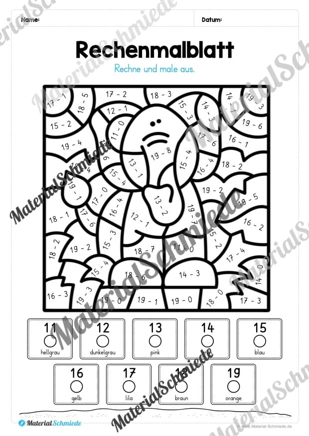 Die Aufgabe für die Schüler besteht darin, die Aufgaben zur Subtraktion im Zahlenraum bis 20 auf dem Bild zu lösen. Je nach Ergebnis, soll eine andere (vorgegebene) Farbe ausgemalt werden. So lernen die Schüler spielerisch Rechnen.