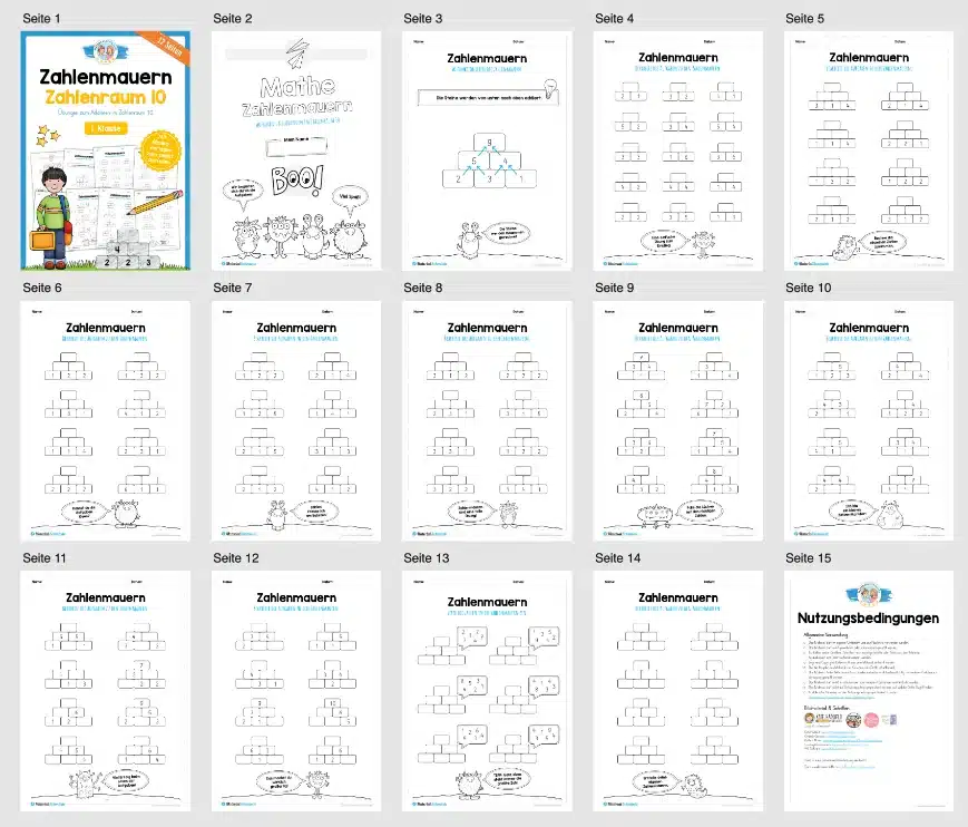 Dieses Materialpaket enthält insgesamt 12 Arbeitsblätter zum Thema Zahlenmauern im Zahlenraum 10.