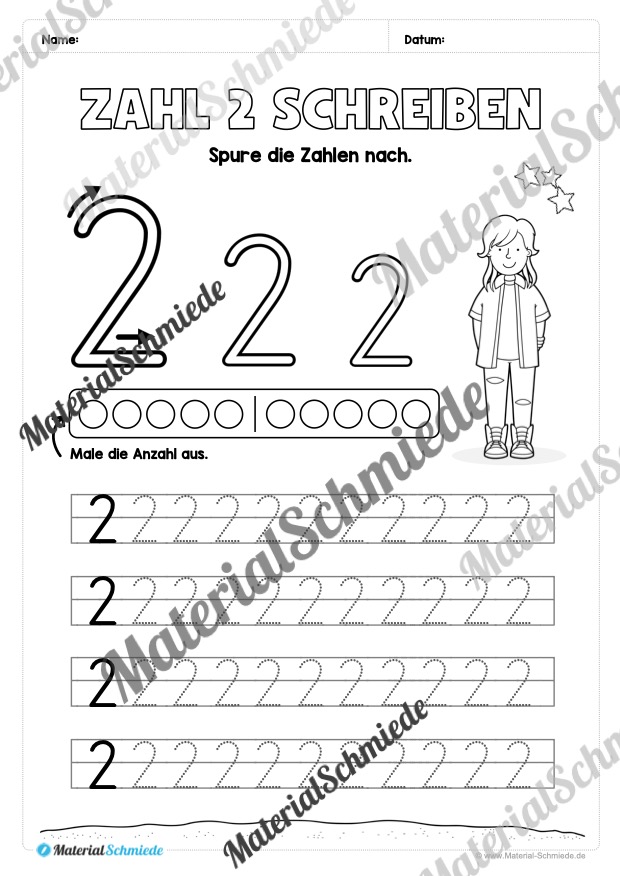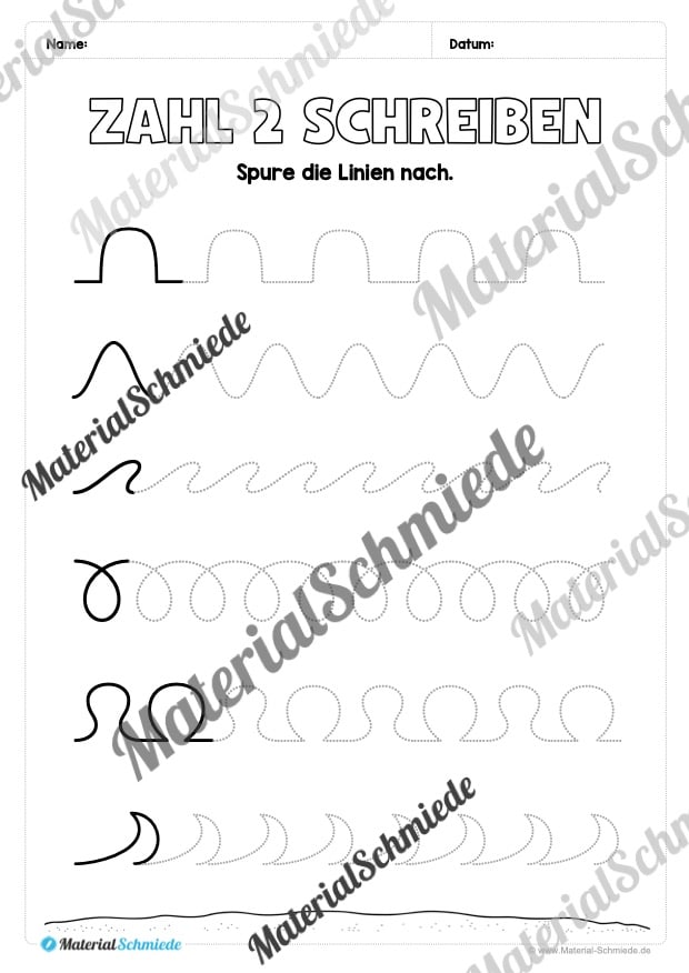 Als Einstieg sollen die Kinder einfache Schwungübungen nachspuren, die der Zahl 2 sehr ähnlich sind. Anschließend folgen verschiedene Übungen zum Nachspuren und Schreiben der Zahl 2. Um auch eine spielerische Komponente mit einzubringen, haben wir zusäztlich einige Aufgaben mit Würfeln und dem Einkreisen von Zahlen eingebaut. So verlieren die Kinder nicht die Motivation beim Lernen.