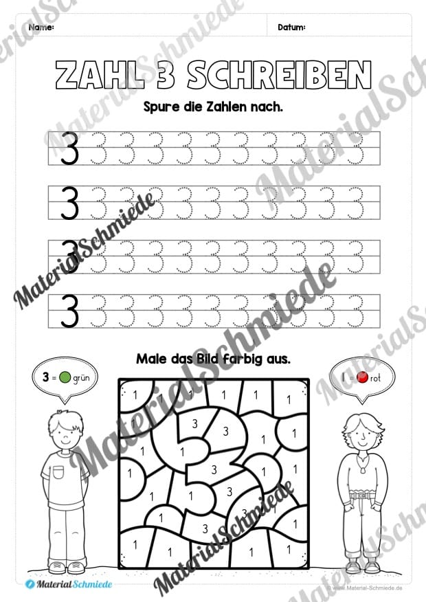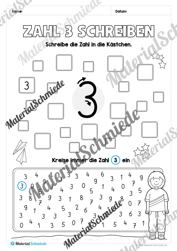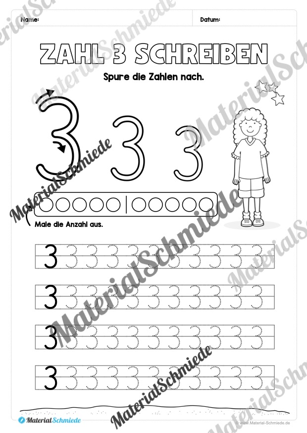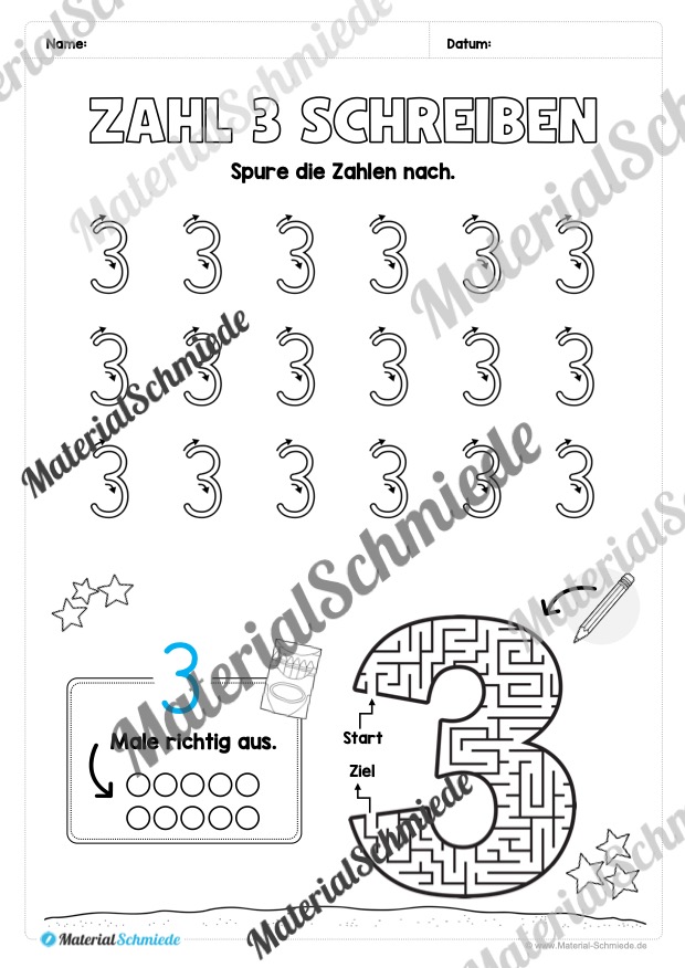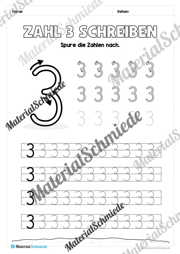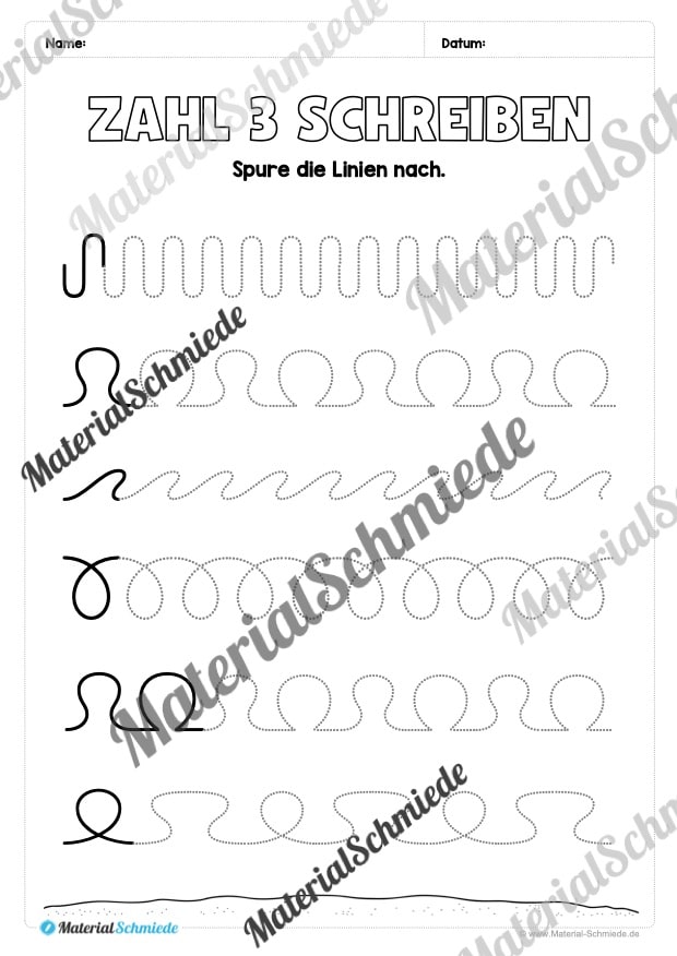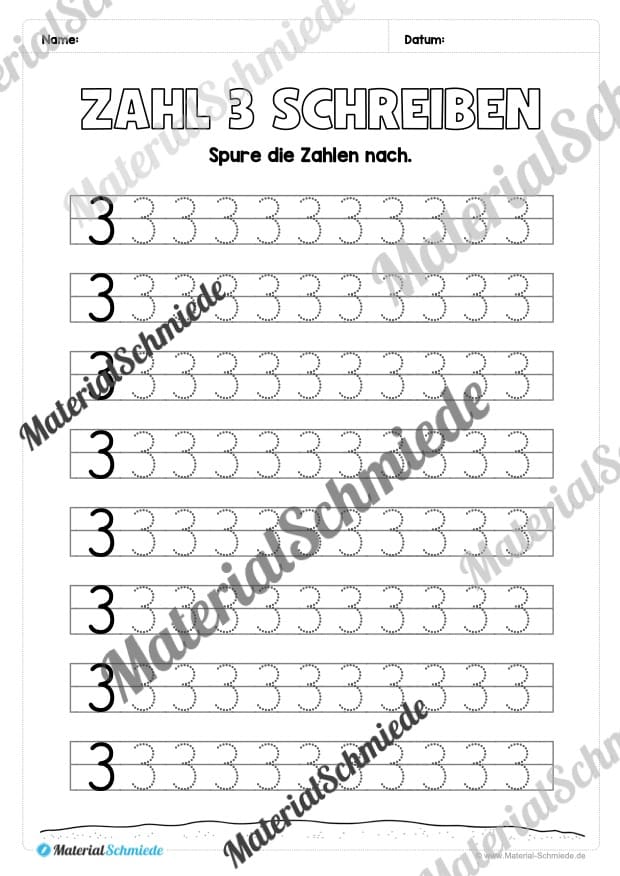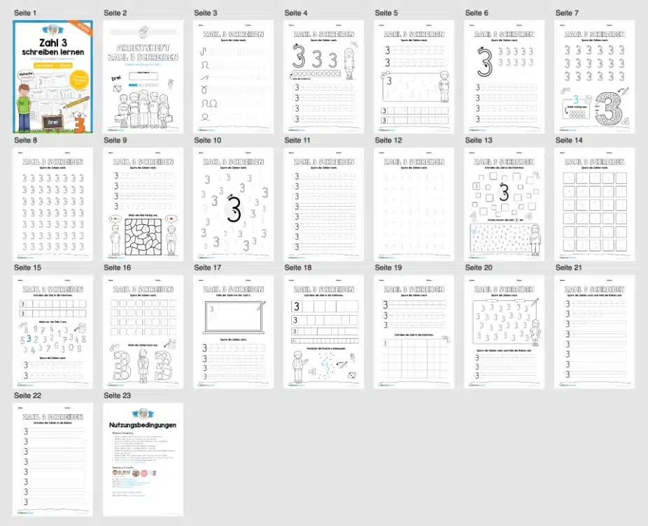 Dieses Arbeitsheft beinhaltet insgesamt 20 verschiedene Arbeitsblätter zum Schreiben lernen der Zahl 3.