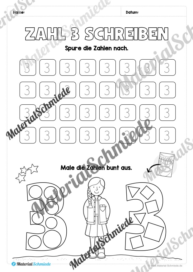 Ihr könnt den Schülern sowohl alle 20 Arbeitsblätter zur Zahl 3 aushändigen oder euch die für euren Unterricht am besten geeigneten Übungen heraussuchen. Je nach dem, wie umfangreich die Aufgaben werden sollen.
