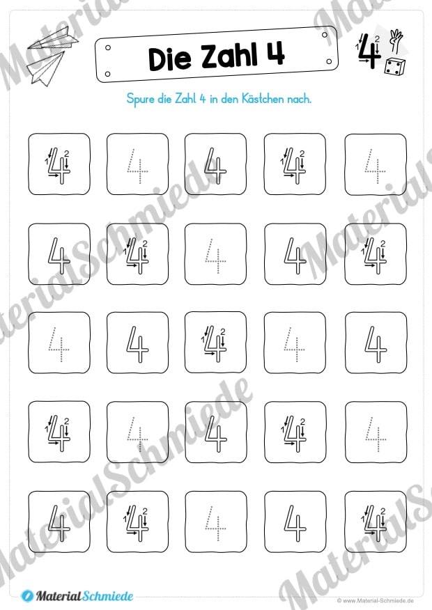 Dieses Arbeitsheft beinhaltet insgesamt 25 verschiedene Arbeitsblätter zum Schreiben lernen der Zahl 4.