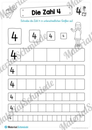 Ihr könnt den Schülern sowohl alle 25 Arbeitsblätter zur Zahl 4 aushändigen oder euch die für euren Unterricht am besten geeigneten Übungen heraussuchen. Je nach dem, wie umfangreich die Aufgaben werden sollen.