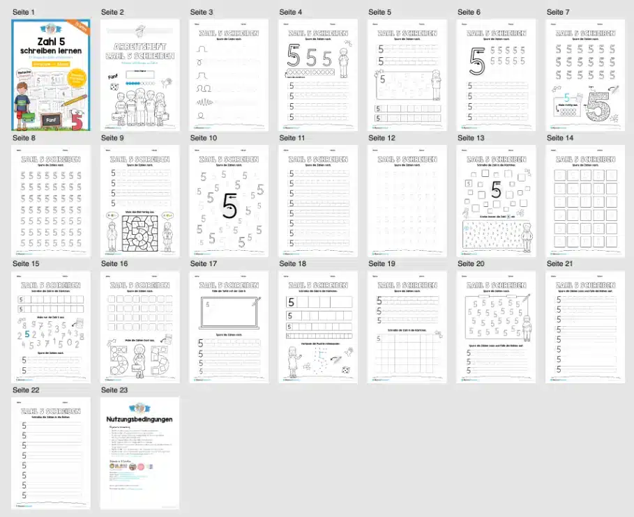 Dieses Arbeitsheft beinhaltet insgesamt 20 verschiedene Arbeitsblätter zum Schreiben lernen der Zahl 5.