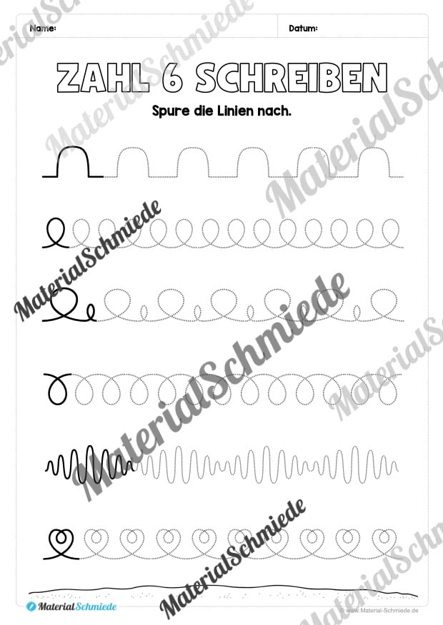 Als Einstieg sollen die Kinder einfache Schwungübungen nachspuren, die der Zahl 6 sehr ähnlich sind. Anschließend folgen verschiedene Übungen zum Nachspuren und Schreiben der Zahl 6. Um auch eine spielerische Komponente mit einzubringen, haben wir zusäztlich einige Aufgaben mit Würfeln und dem Einkreisen von Zahlen eingebaut. So verlieren die Kinder nicht die Motivation beim Lernen.